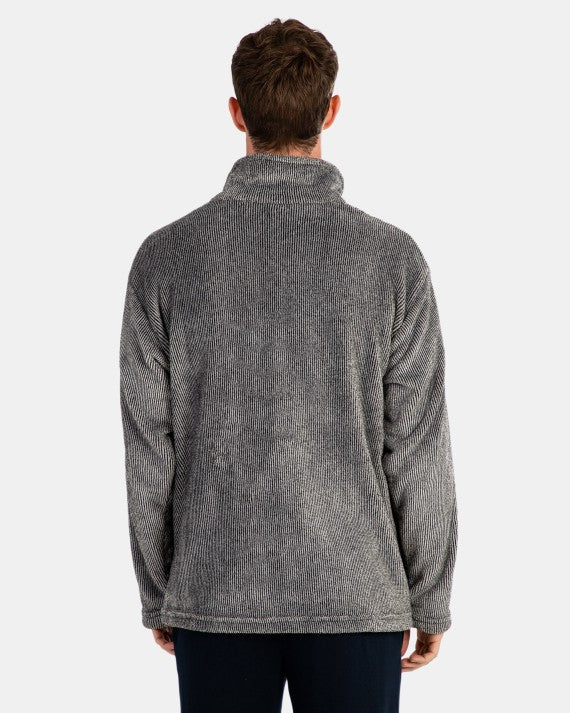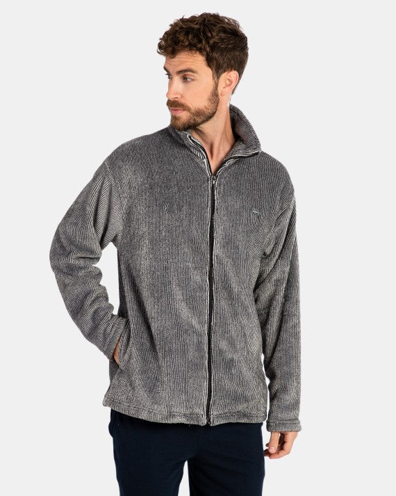 Bata corta en tejido tipo polar con estampado listado bicolor, con cremallera, cuello alto y dos bolsillos, de aspecto suave y agradable al tacto.